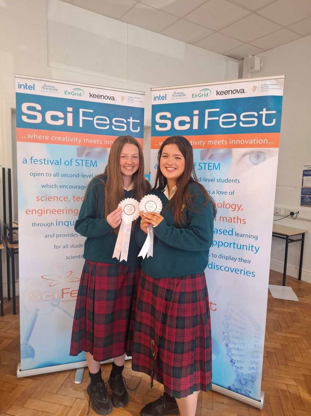 The “EirGrid Cleaner Climate” rosette ans Student choice Award went to “Solar Oven vs Gas Oven” by Alison Hynes and Ellen McGowan. The runner up student choice award went to “Feeling good about your appearance affects your performance in sport” by Aoibheann Geraghty, Leah Forde, and Oriel Thompson. The “Mallinckrodt STEM” rosette went to “How to get rid of a body Sustainably” by Louise Gallogly, Eliza O’Reilly Doyle, and Sarah Jane Mac Dermot. The Scifest award went to “How does cosmetic treatments effect our health” by Issy Mc Govern, Zoe Whyms, and Orlaith Conlon. The Scifest 20th anniversary award went to “The effect of caffeine on physical vs mental performance” by Maia O’Regan and Lucy Smith.